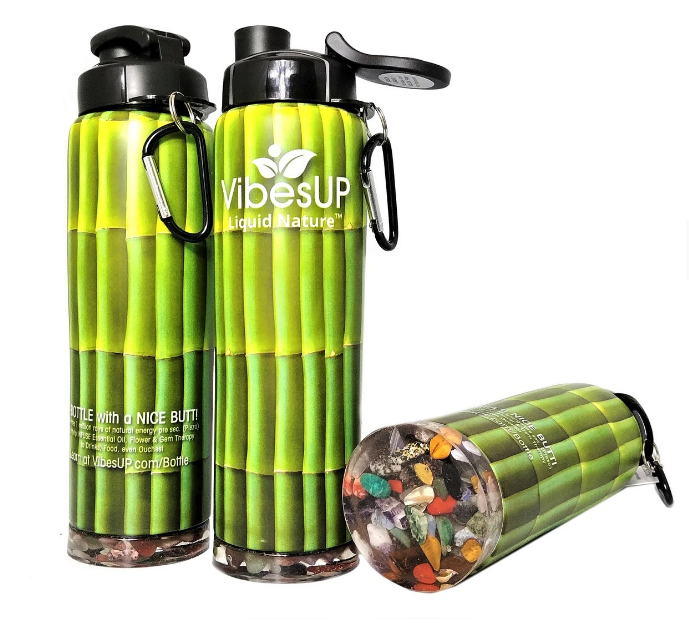 the funnel going both ways in perfect energy. There are other benefits people notice when using a Vibe Bottle ie: TASTE (it's slighty sweeter at the higher vibration), TEXTURE (it feels more silky), ALIVENESS (it tastes more alive at the healthy high vibration), MEMORY (water takes on the properties of what it is around). The gemstone disc at the base of the vibe bottles have a renewable energy technology that can help imprint, GEMSTONE, ESSENTIAL OIL and FLOWER ESSENCES through your bottle to the water with its infrared style delivery of REAL NATURE! Feeding healthy earth energy to our bodies and pulling the excess toxic energy off. At the same time it is re-balancing our systems like living directly on the earth would. VibesUP Products are also in the exact perfectly balanced ratio of push to pull as the planet. This is known as the Phi, Golden Measurement, or the sacred polarity ratio in nature. They help bring the healthy balancing benefits of the earth back into